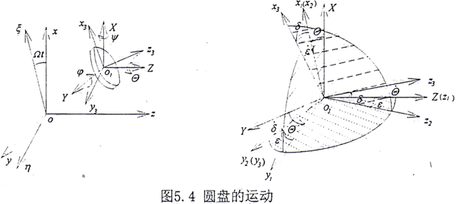 圓盤的運動可分解成隨其質(zhì)心的平動和繞質(zhì)心的轉(zhuǎn)動。質(zhì)心o1的平動位移為(xc,yc),不計沿z軸方向的運動。圓盤繞質(zhì)心的轉(zhuǎn)動可用三個歐拉角來表示,如圖5.4所示。設(shè)o1XYZ是與oxyz平行的坐標系。o1XYZ坐標系的單位矢量為